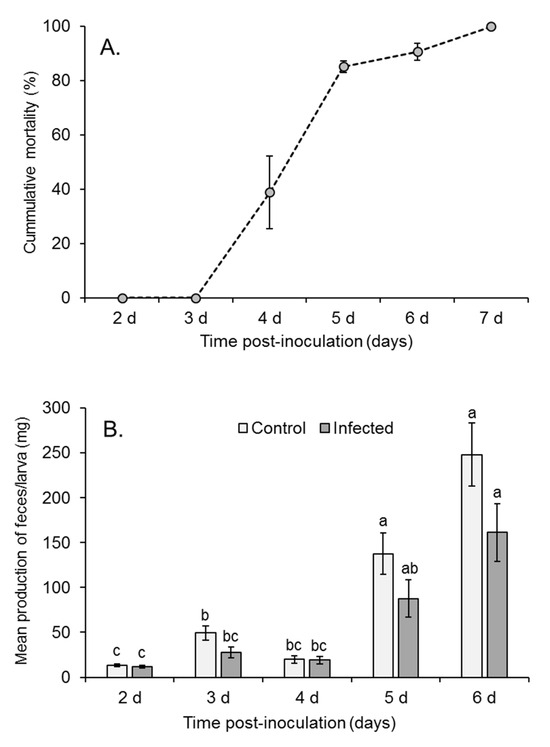 (A) Mean (±SE) cumulative mortality of fourth instars of Spodoptera frugiperda at 2–7 days post-inoculation. (B) Mean (±SE) fresh weight of feces collected from control and infected larvae at 2–6 days post-inoculation. Samples were not collected on the day of death of larvae to avoid contamination from OBs released from insect cadavers. Columns headed by identical letters did not differ significantly (repeated measures ANOVA, Tukey p > 0.05).
