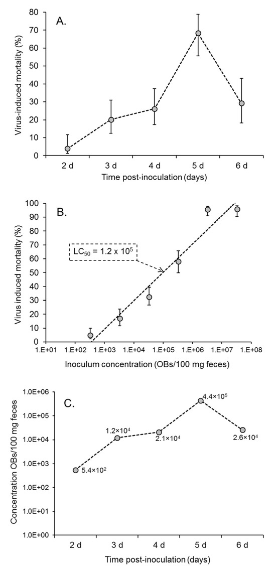 The bioassay of 100 mg fecal samples from healthy larvae that were spiked with different quantities of OBs resulted in a positive correlation between inoculum concentration and prevalence of virus-induced mortality (F = 129.8; df = 1, 20; p < 0.001) (Figure 3B). The logit regression equation was y = 1.357(±0.1686)x − 6.894, where y is Ln(p/q), in which p is the proportion of virus-induced mortality, and q is the proportion of larvae that did not succumb to disease. Using this equation, the concentration of OBs in the fecal samples from infected larvae was estimated and increased from 5.4 × 102 OBs/100 mg feces (in 1 mL of fecal suspension) in the 2-day samples to a maximum of 4.4 × 105 OBs/100 mg feces in the 5-day samples (Figure 3C).
