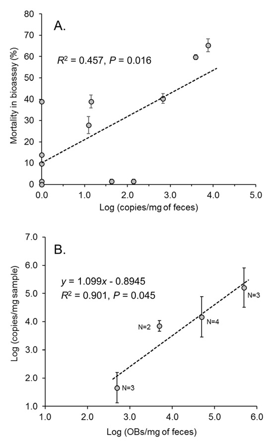 qPCR quantification of SfMNPV genome copies in fecal samples: (A) Correlation of logarithm of number of genome copies/mg of feces and the mean (±SE) percentage of virus-induced mortality of S. frugiperda second instars that were inoculated with fecal samples. (B) Estimates of genome copies/mg of fecal samples spiked with 5 × 102–5 × 105 OBs/mg. Numbers next to data points indicate the number of replicate samples that amplified in the qPCR assay.