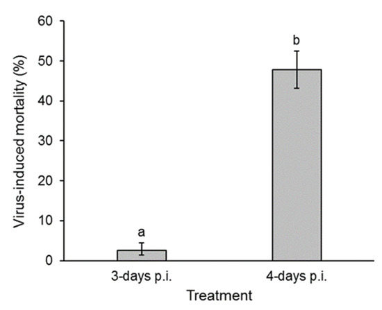 Mean (±SE) prevalence of lethal infection in S. frugiperda second instars that were exposed to the feces of fourth-instar larvae at 3 and 4 days post-inoculation (p.i.) on maize plants in a greenhouse experiment. Columns headed by different letters differ significantly (GLM, p < 0.05). No virus-induced mortality was observed in control insects.