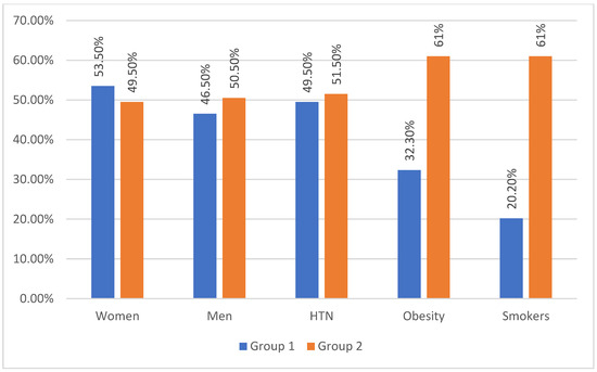 Group characterization according to gender, presence of hypertension, obesity, and active smoking (HTN—HTN-hypertension). Group 1—post-CIVID-19 patients; Group 2—patients without a COVID-19 history.