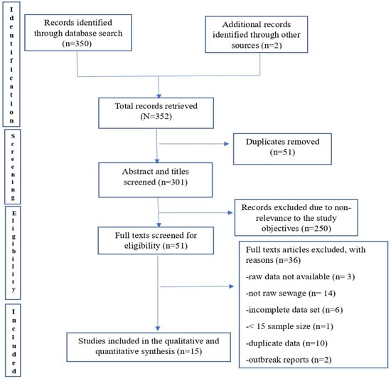 A total of 352 publications were identified via electronic database and citations search. Fifty-one duplicates were removed after the initial screening. Further, the screening of article titles and abstracts resulted in the exclusion of 250 irrelevant records. A total of 51 potentially relevant articles were assessed for eligibility, out of which 36 were further excluded due to reasons that included unavailability of raw data, wastewater type not raw wastewater, incompleteness of data set, data duplications, case-based epidemiological reports, and sample size inadequacy. The remaining 15 peer-reviewed articles with satisfactory qualities were included in the qualitative and quantitative synthesis (Figure 1 and Table 1) [9,17,18,19,20,21,22,23,24,25,26,27,28,29,30]. The studies recorded moderate (10/15) to high-quality (5/15) assessment scores. Table 1 depicts the characteristics of included individual studies and quality assessment scores. According to the United Nations demarcation, there were 6 studies from North American countries, 7 from Europe and Central Asia, and 1 each from countries in Latin America and the Caribbean and the East Asia and Pacific region. Most studies (n = 13) were conducted in 2022 while only 2 studies were conducted in 2023. Thirteen of the studies obtained composite samples, while 1 obtained a grab sample and both grab and composite samples. The methods employed for viral recovery from wastewater included adsorption extraction (n = 2), centrifugation (n = 6), ultracentrifugation (n = 1), vacuum filtration (n = 1), PEG precipitation (n = 1), PEG precipitation and adsorption elution method combined (n = 1), and unknown (n = 3). Most studies employed real-time quantitative PCR (qPCR) (n = 11) while only 4 used the digital droplet PCR (ddPCR) for genomic DNA detection and quantification. Ten studies obtained both wastewater and clinical samples data, but only a part of them provided a complete data set for computing correlation coefficients while the others described phylogenetic results for MPXV-positive samples.