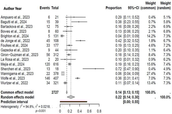 Out of 352 studies, 15 were eligible for a meta-analysis. Among included studies, the individual positivity rate of the MPXV ranged from 1% to as high as 27%. The meta-analysis included a total number of 2727 wastewater samples (526 showed positivity), revealing an overall MPXV positivity rate of 22% (95% CI: 14−30%; I2 = 94.8%) (Figure 2). Of note, the analyzed samples are not reflective of the overall specimens included in these studies (Table 1) since only a minority met the inclusion criteria.