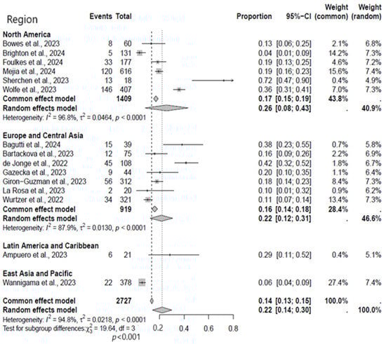 A subgroup analysis was performed to identify regions with significant evidence of MPXV circulation in the environment. The stratified analysis showed that the rate of MPXV detection was substantially higher in studies from North America (26%, 95% CI: 8–43%) than in studies from Europe and Asia (22%, 95% CI: 12–31%) (Figure 3). At the same time, both regions exhibited a statistical heterogeneity.