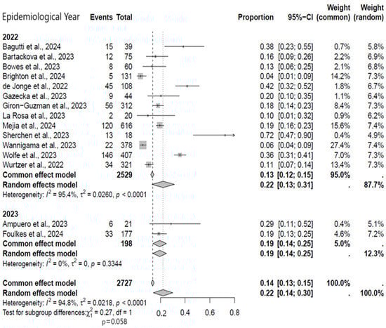 In the subgroup analysis for the epidemiological year, most of the studies included were published in the year 2022. The meta-analysis for the year 2022 included a total number of 2529 wastewater samples (497 samples showed positivity) while the year 2023 comprised 198 samples (39 showed positivity) (Figure 4). When comparing the frequency of viral detection, this was significantly higher in the year 2022 studies (22%, 95% CI: 13–31%) compared to 2023 (19%, 95% CI: 14–25%). Overall, there was no statistically significant heterogeneity in the year 2023. This is expected because the positivity rate is far below what was recorded in the preceding year.