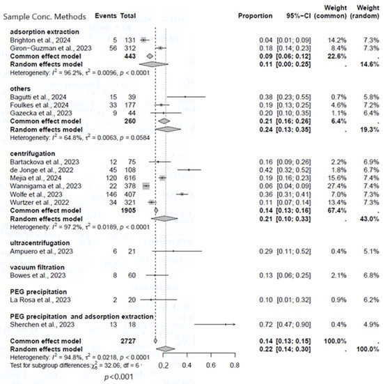Subgroup analysis forest plot of MPXV positivity in wastewater based on sample concentration methods [9,17,18,19,20,21,22,23,24,25,26,27,28,29,30].