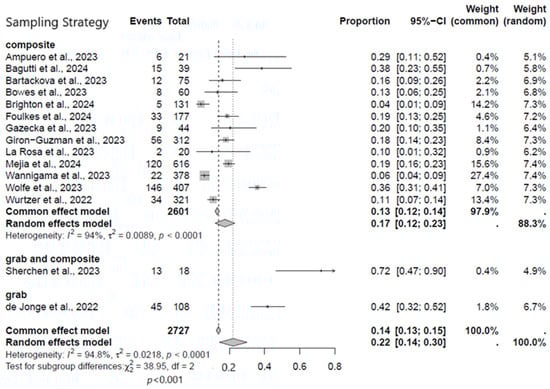 Additionally, considering the relevance of the sampling strategy, we performed a subgroup analysis to assess the best type of sampling adopted in the study that met the inclusion criteria. For instance, sampling is a method that allows researchers to infer information about a population based on results from a subset of the population, without having to investigate every individual. Since most of the studies did not meet the inclusion criteria, we decided to perform a subgroup analysis based on the sampling strategy adopted in the studies that we used for the meta-analysis. Overall, the studies included in the meta-analysis adopted three different types of sampling strategies, of which a total number of 2727 were composite samples with an overall MPXV positivity rate of 17% (95% CI: 12−23%; I2 = 94%) (Figure 6).