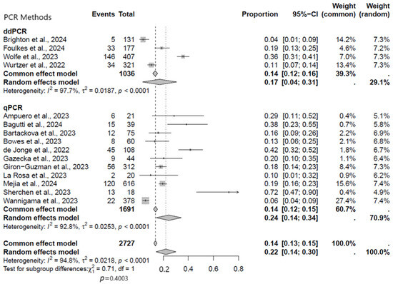On the basis of PCR methods, we performed a subgroup analysis to see which methods of PCR performed best in the current meta-analysis. In terms of viral DNA detection rates, studies that employed qPCR appeared to have performed better compared to the ddPCR platforms. In the subgroup analysis, the pooled rate of MPXV detection across different regions was significantly higher using the qPCR studies (24%, 95% CI: 14–34%) than in ddPCR studies (17%, 95% CI: 4–31%) (Figure 7).