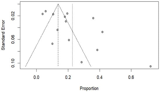 The outcomes of Egger’s regression test and the irregularity in the funnel plot demonstrated notable publication bias within the studies encompassing knowledge that was incorporated in this meta-analysis (bias: 4.5685 (SE = 1.9154); t = 2.39, df = 12, p-value = 0.0344), thus rejecting the null hypothesis of symmetry. Thus, it can be shown that the asymmetry in the results and in the image explains the wide differences in the reported positivity values (Figure 8).