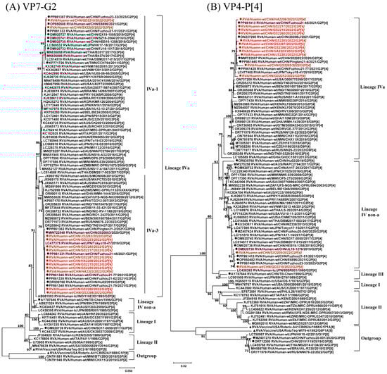 - Mao, T.; Wang, M.; Wang, J.; Ma, Y.; Liu, X.; Wang, M.; Sun, X.; Li, L.; Li, H.; Zhang, Q.; et al. Phylogenetic analysis of the viral proteins VP4/VP7 of circulating human rotavirus strains in China from 2016 to 2019 and comparison of their antigenic epitopes with those of vaccine strains. Front. Cell. Infect. Microbiol. 2022, 12, 927490. [Google Scholar] [CrossRef]