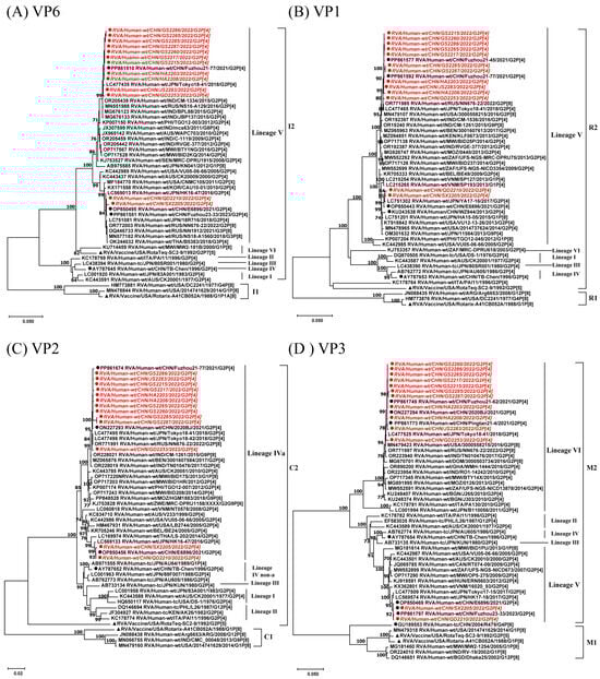 3.3. Phylogenetic Analysis of VP1-VP3, VP6, and NSP1-NSP5 Genes