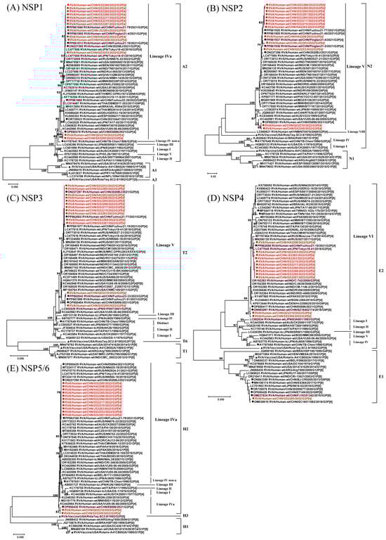 The NSP1–NSP3 and NSP5 genes exhibited nucleotide sequence identities ranging from 94.7% to 100%, while the NSP4 segment showed an identity of 82.1–100%. The phylogenetic trees of NSP1–NSP5 showed similar clustering patterns to those of VP1–VP3 and VP6. Notably, GS2265 was uniquely positioned in the E1 lineage for the NSP4 gene. This strain clustered with Wa-like strains from multiple regions in China, including Beijing, Fujian, and Sichuan, as well as strains from neighboring countries (e.g., Japan and India) during the period 2013–2022. GS2265 showed nucleotide identities of 98.8–99.9% with Chinese Wa-like strains and 98.5–99.6% nucleotide identities with Wa-like strains from neighboring countries. In the NSP4 gene, the nucleotide identity between GS2265 and other strains in this study ranged from 82.3% to 99.8%. The Wuhan E6896 strain shared 99.4–100% nucleotide identities across five genome segments with QD2210 and SX2205. Most of the other RVA strains were closely related to G2P[4] strains from mainland China and Japan. Additionally, in the NSP4 and NSP5 genes, these strains clustered with contemporary Russian strains 557 and NN2924–21, with an identity of 99.5–99.8% and 99.9–100%, respectively. The RotaTeq vaccine strains were positioned in lineages A3, T6, and H3 for the NSP1, NSP3, and NSP5 segments, respectively. In contrast, all segments of the Rotarix strain were located in lineage I (Figure 3).