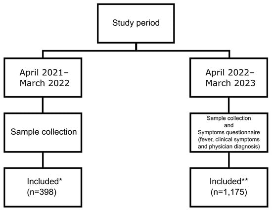 Respiratory specimens were collected from outpatients presenting with ARI symptoms who visited any of three hospitals or one private clinic in Mie Prefecture between April 2021 and March 2023. ARI was defined based on the following criteria: (1) the presence of at least one of four respiratory symptoms (cough, runny nose, sore throat, wheezing) and (2) clinical assessment by a physician indicating suspected ARI. Specimens (nasopharyngeal swabs or nasal discharge) were collected using a swab (#260999, Fujirebio Inc., Tokyo, Japan), suspended in 3 mL of transport medium (UT-300, Sugiyama-Gen Co., Ltd., Tokyo, Japan) and stored at −80 °C until nucleic acid extraction. The study period was divided into two phases (see Figure 1 and Figure 2). During the first phase (April 2021 to March 2022), respiratory specimens were collected from patients displaying ARI symptoms. In the second phase (April 2022 to March 2023), respiratory specimens were collected as in the first phase, but additional data were gathered using a symptom questionnaire. The collected data encompassed fever records (maximum body temperature), respiratory symptoms (presence or absence of cough, runny nose, sore throat, wheezing and general fatigue) and physician diagnosis (Figure 1).