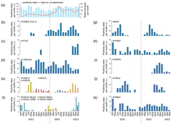 Monthly distribution of respiratory viruses in Mie Prefecture from April 2021 to March 2023. (a) Total specimens tested (red lines, right y-axis) and overall positivity rates (right blue bar, left y-axis). (b–k) Positivity rates for individual viruses: (b) SARS-CoV-2; (c) influenza virus type A (FluA); (d) human rhinovirus/enterovirus (HRV/EV); (e) human parainfluenza virus types 1, 3 and 4 (HPIV1, 3, 4); (f) human coronaviruses (HCoV-NL63, HCoV-HKU1, HCoV-229E, HCoV-OC43); (g) respiratory syncytial virus (RSV); (h) human adenovirus (HAdV); (i) human metapneumovirus A/B (HMPV); (j) human parechovirus (HPeV) and (k) human bocavirus (HBoV). Influenza virus A H1N1pdm09 (FluA/H1N1pdm), influenza type B (FluB) and human parainfluenza type 2 were not detected. Positivity rates are presented as percentages on the left y-axis for all panels. The vertical red dashed lines indicate the change in the specimen collection method (see Figure 1 for details).