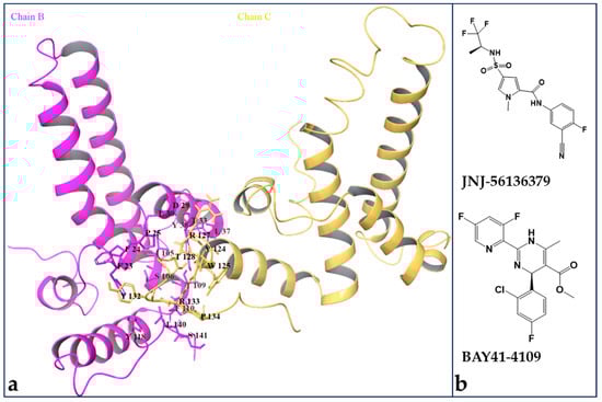 The 3D structure of the HBV Cp tetramer and the 2D structure of the CAM compounds used in this study. (a) The residues at the interface of the two subunits of two Cp dimers in the context of the HBV capsid (PDB code: 5D7Y), i.e., the HAP pocket, are highlighted. (b) The 2D structures of JNJ-56136379 and BAY41-4109.