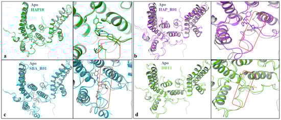 An overlay of some CAM structures onto the apo structure (3J2V, gray) reveals quaternary and local structural changes near the ligand binding sites. (a–d) There are significant differences in structure, as all the CAMs induce conformational changes in the hydrophobic pocket, indicative of opening to accommodate compound binding compared to the close apo structure, shown in the region marked in red.
