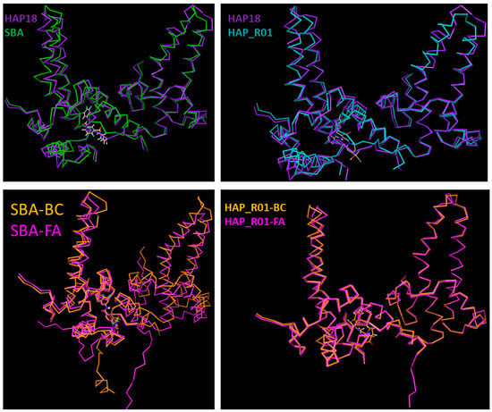 A comparison of HAP- and SBA-bound crystal structures showing distinctly different changes in tertiary and quaternary structures at the level of the dimer. Despite similar HAP/SBA binding sites being occupied, the effect on the local structure is distinct in each case. (Top panels) The overlay of BC dimers from the HAP18-bound capsid structure (5D7Y, purple) on corresponding subunits from the SBA-bound capsid structure (5T2P, green) based on the superposition of capsid symmetric units. There are significant differences in structure as both HAP and SBA induce conformational changes affecting the binding pocket and the global structure. (Bottom panels) The overlay of BC and FA dimers from the SBA-bound capsid structure (5T2P, orange (BC) magenta [FA]) on corresponding subunits from the HAP_R01-bound capsid structure (5WRE, orange (BC) magenta [FA]). There are large differences in the tertiary structure, especially in the SBA-bound structure.