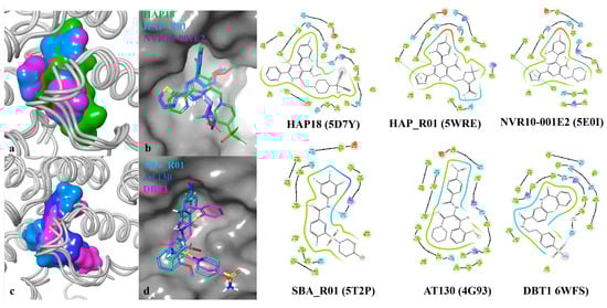 Comparison of HAP (a,b) and other CAM (c,d) compounds at dimer–dimer interface and ligand–protein interactions of selected CAMs bound to HBV capsid and hexamer structures, as observed in X-ray or CryoEM.