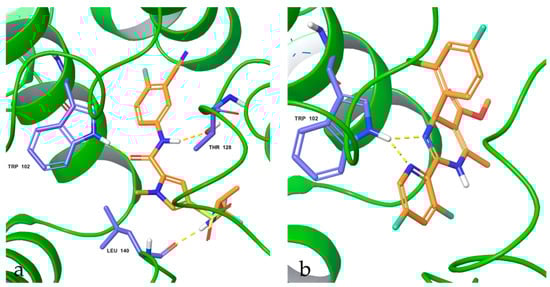 For some of the mutated amino acid residues, the default and most populated rotamers which favor nucleophilic interaction were selected, and the default rotamer was the most populated empirically determined conformation. Thereafter, the structures had their energy minimized to obtain a low energy state in the energy landscape. Due to the structural difference between these two compounds (JNJ-56136379 and BAY41-4109), we modeled the interactions as shown in Figure 5. JNJ-56136379 binds to the wildtype Cp with three hydrogen bonding interactions: the hydrogen bond contact between the amide carbonyl oxygen atom and the NH group of the indole ring of Trp102, the hydrogen bond between the amide NH group with the side chain oxygen atom of Thr128, and the hydrogen bond of the NH group to the hydroxyl of Leu140 (Figure 5a). Two hydrogen bonds of the NH group of the indole ring of Trp102 bind to BAY41-4109 (Figure 5b).