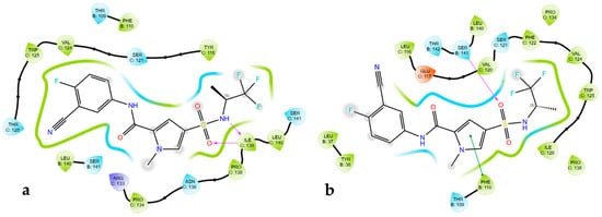 The results of the docking calculations performed using the Glide scoring function observed for the JNJ-56136379 and BAY41-4109 compounds are summarized in Table 3 for the top predictive systems (at least 50% prediction for both resistant [lower docking scores than the WT] and sensitive mutants [higher docking scores than the WT]) and Tables S1–S9. Based on the docking scores in comparison to the wildtype, some variants altered the binding pattern and reduced the binding affinity. Using the crystal structures of the HBV capsid in complex with HAP (5D7Y, chain BC) and SBA (5T2P, chain FA) gave the best prediction of both resistance and sensitivity to JNJ-56136379 and BAY41-4109 (Table S10). For JNJ-56136379, comparing the docking score of the wildtype and other Cp mutants, 8/16 (50%) resistant mutants (i.e., relative resistance ≥ 2) were predicted to show reduced binding scores, while 10/15 (67%) resistant mutants showed reduced binding scores for BAY41-4109. In addition, 16/18 (89%) Cp mutants sensitive (i.e., relative resistance ≤ 2) to JNJ-56136397 showed similar or increased binding scores with the WT Cp, whereas 8/19 (45%) Cp mutants sensitive to Bay 41-4109 showed similar or increased binding scores to the WT Cp. In summary, HAP18/5D7Y predicted favorably for JNJ-56136379 and the SBA_R01/5T2P-FA model predicted resistant/sensitive mutants for both JNJ-56136379 and BAY41-4109. Furthermore, SBA_R01 and JNJ5613-6379 have similar structural features to the SBA scaffold and thus favor its prediction (Table 3).