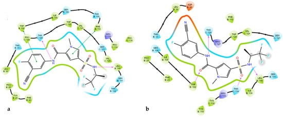 Ligand interaction from docking model of JNJ-56136379 with HBV capsid protein (PDB ID: 5D7Y). (a) F24Y and (b) P134T mutation interaction; hydrogen bonds are shown in pink, while green is pi stacking bond.