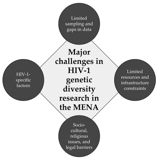 This review identified four key themes that represent barriers to the accurate characterization of HIV-1 genetic diversity in the MENA region. These four themes were limited sampling and data gaps, resource and infrastructure constraints, HIV-specific factors, and socio-cultural and legal issues.