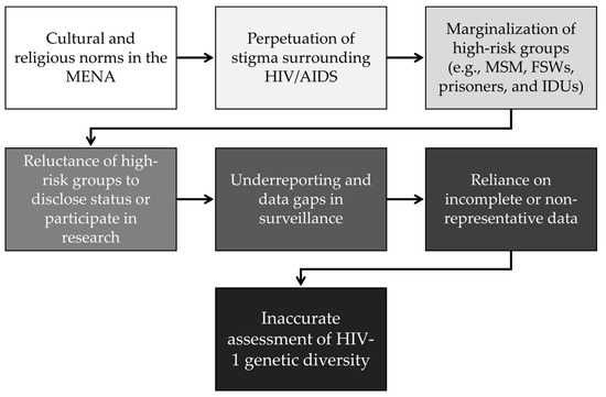 Socio-cultural and legal barriers can significantly hinder efforts to characterize HIV-1 genetic diversity in the MENA region, as reported in several included records and in the process shown in Figure 5.