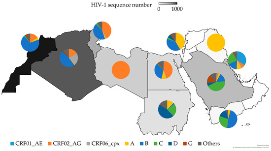 All publicly available HIV-1 sequences annotated as originating from MENA countries were systematically retrieved from the Los Alamos HIV Database (http://www.hiv.lanl.gov/; accessed on 10 February 2025) using the advanced search tool [116,117,118]. Data on HIV-1 subtype/CRF/URF classifications, along with country of origin, were extracted and utilized to construct a comprehensive geographic distribution map of HIV-1 genetic diversity across the MENA region.