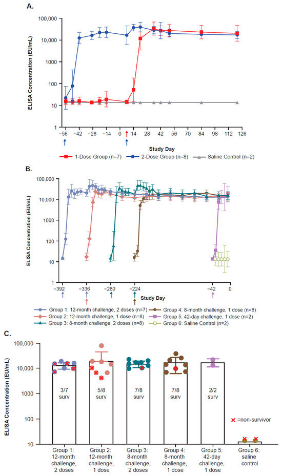 ZEBOV-GP-specific IgG binding antibody responses (geometric mean +/− SD) post-vaccination as measured by ELISA (EU/mL) over time prior to challenge in Study 1 (A) and Study 2 ((B,C) [last sample day prior to challenge]). For samples with ELISA reported as <LLOQ, the LLOQ value of 13.62 EU/mL was used for the calculation of group means. (A): Arrows depict the day of rVSVΔG-ZEBOV-GP administration: Day −56 (two-dose group only) and Day 7 (both rVSVΔG-ZEBOV-GP dose groups). ELISA responses from blood collected at the “pre-bleed” study time point are shown at Day −56. Pre-bleed samples were collected prior to Day −56, and no blood samples were collected on Day −56. (B): Arrows depict the day of rVSVΔG-ZEBOV-GP administration: Day −392 (Group 1), Day −336 (Groups 1, 2), Day −280 (Group 3), Day −224 (Groups 3, 4), and Day −42 (Group 5 rVSVΔG-ZEBOV-GP, Group 6 saline). (C): ELISA concentration (EU/mL) at 7 days before challenge for each group. ELISA, enzyme-linked immunosorbent assay; EU, enzyme units; LLOQ, lower limit of quantitation; mo, month; SD, standard deviation; surv, survivor.