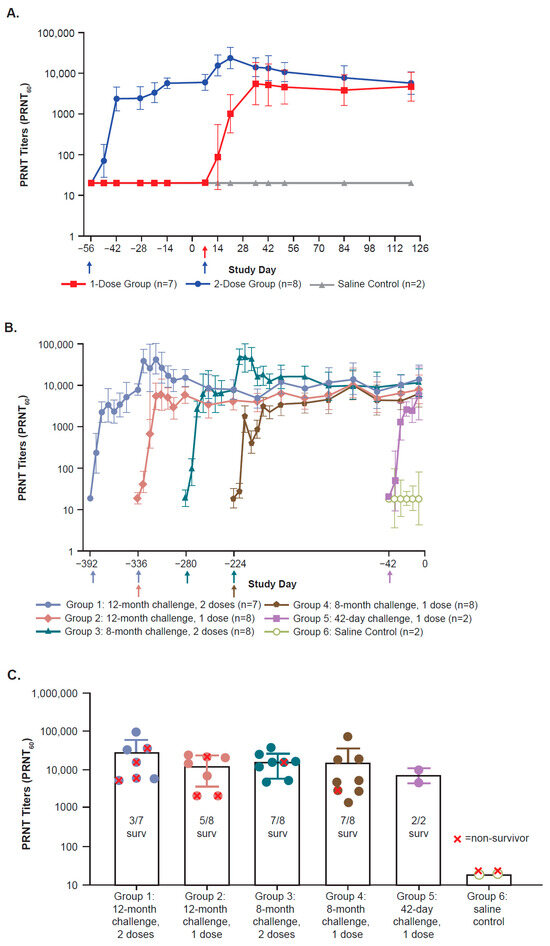 ZEBOV-GP-specific neutralizing antibody responses (mean +/− SD) post-vaccination as measured by PRNT titers (PRNT60) over time prior to challenge in Study 1 (A) and Study 2 ((B,C) [last sample day prior to challenge]). The PRNT LLOQ is 35; however, PRNT values were reported down to an LLOD value of 20. For samples with PRNT reported as <20 (less than LLOD), the LLOD value of 20 was used for the calculation of group means. (A): Arrows depict the day of rVSVΔG-ZEBOV-GP administration: Day −56 (two-dose group only) and Day 7 (both rVSVΔG-ZEBOV-GP dose groups). PRNT responses from blood collected at the “pre-bleed” study time point are shown at Day −56. Pre-bleed samples were collected prior to Day −56, and no blood samples were collected on Day −56. (B): Arrows depict the day of rVSVΔG-ZEBOV-GP administration: Day −392 (Group 1), Day −336 (Groups 1, 2), Day −280 (Group 3), Day −224 (Groups 3, 4), and Day −42 (Group 5 rVSVΔG-ZEBOV-GP, Group 6 saline). (C): PRNT titers (PRNT60) at 7 days before challenge for each group. LLOD, lower limit of detection; LLOQ, lower limit of quantitation; mo, month; PRNT, plaque reduction neutralization test; SD, standard deviation; surv, survivor.