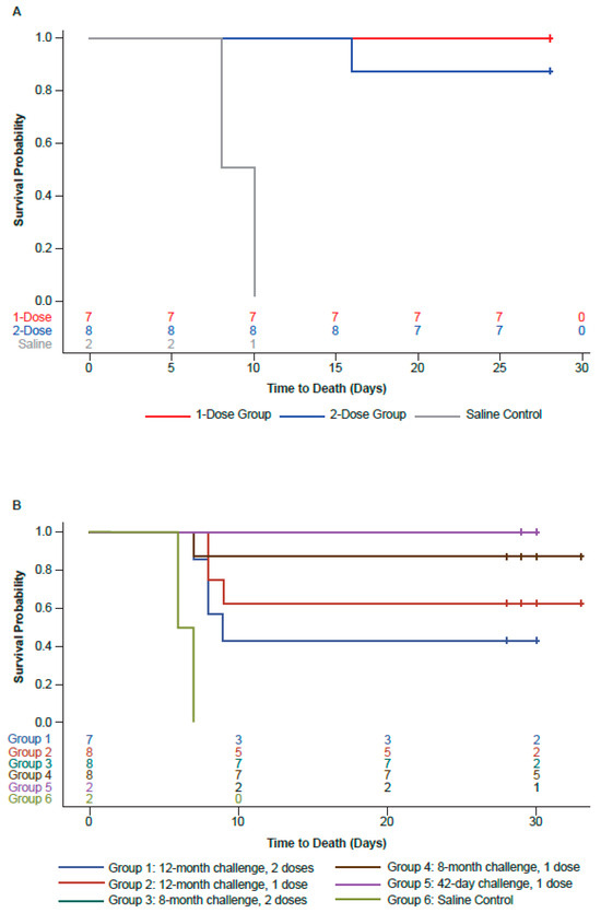 Kaplan–Meier survival plot by vaccination group showing survival outcomes after challenge in (A) Study 1 and (B) Study 2. Animals alive at the end of in-life assessment were censored at the time of euthanasia (indicated by “+”). Log-rank tests of the survival curve = not significant. Fisher’s test for the percent survival = not significant.