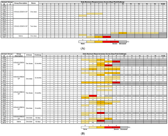 During the challenge phase, awake observations were conducted at least once daily and increased in frequency following the development of clinical signs of disease. Animals were assigned a responsiveness score from 0 to 4, with 0 being alert and responsive and 4 being persistently prostrate or severely unresponsive. The frequency of cage-side observations returned to once daily when all surviving animals received a responsiveness score of 0. Anesthetized physical examinations, which included the collection of temperature and weight data, were also performed periodically during the challenge phase.