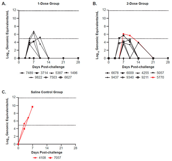EBOV blood viral levels/plasma viral titers (log10 genomic equivalents/mL) post-challenge among (A) the 1-dose, (B) 2-dose, and (C) saline control groups in Study 1. The figure shows plasma viral loads determined by qRT-PCR for each NHP (individual animal IDs are listed below each graph) at various time points, run in triplicate. Inactivated plasma collected on Days 0, 3, 5, 7, 10, 14, 21, and 28 post-challenge, as well as terminal (where applicable), were evaluated for EBOV RNA by qRT-PCR and reported as log10 genomic equivalents per mL (log10 GE/mL). Symbols and lines for non-survivors in each group are shown in red; the last data point represents the day animals met euthanasia criteria, at which time a terminal sample was collected. The dashed lines at 4.9031 and 11.9031 log10 GE/mL represent the lower limit of quantitation (LLOQ) and upper limit of quantitation, respectively. Values below the LLOQ were transformed for graphing purposes and are reported as LLOQ/√2 (or 3.47 log10 GE/mL). Any samples that were determined to be “undetected” or below the limit of detection were assigned a value of 0 for graphing purposes.