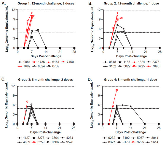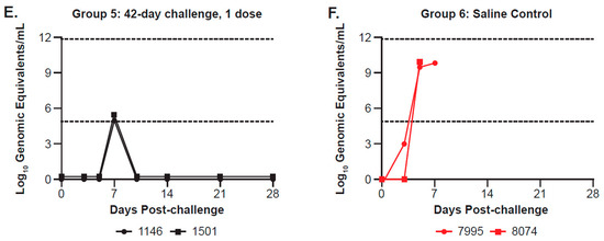 EBOV blood viral levels/plasma viral titers (log10 genomic equivalents/mL) post-challenge among (A) Group 1, (B) Group 2, (C) Group 3, (D) Group 4, (E) Group 5, and (F) Saline Control Group 6 from Study 2. The figure shows plasma viral loads determined by qRT-PCR for each NHP (individual animal IDs are listed below each graph) at various time points, run in triplicate. Inactivated plasma collected on Days 0, 3, 5, 7, 10, 14, 21, and 28 post-challenge, as well as terminal (where applicable), were evaluated for EBOV RNA by qRT-PCR and reported as log10 genomic equivalents per mL (log10 GE/mL). Symbols and lines for non-survivors in each group are shown in red; the last data point represents the day animals met euthanasia criteria, at which time a terminal sample was collected. The dashed lines at 4.9031 and 11.9031 log10 GE/mL represent the lower limit of quantitation (LLOQ) and upper limit of quantitation, respectively. Values below the LLOQ were transformed for graphing purposes and are reported as LLOQ/√2 (or 3.47 log10 GE/mL). Any samples that were determined to be “undetected” or below the limit of detection were assigned a value of 0 for graphing purposes.