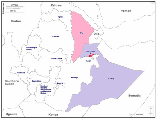 Map showing the Dire Dawa City Administration where the Dengue outbreak occurred, and the study of DENV strains originated. The shaded areas indicate the epicenters of dengue outbreaks in Ethiopia since 2013: Dire Dawa (red), Afar (red-violet), and Somalia (light blue).