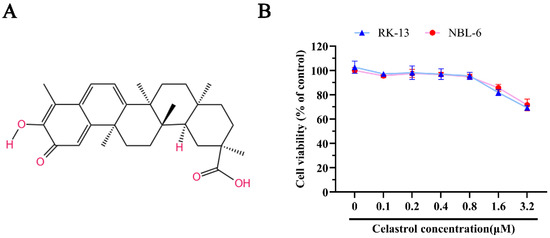 The chemical structure and cell cytotoxicity of celastrol. (A) The illustration of celastrol’s chemical structure. (B) The viability of celastrol in RK-13, and NBL-6 cells. These cells were seeded into 96-well cell plates, respectively, then incubated with celastrol at different concentrations (0.1, 0.2, 0.4, 0.8, 1.6 and 3.2 μM) for 24 h, the viability of the cells was detected by cck-8 kit. The relative cell viability of non-treated cells with celastrol served as blank control (set up as 100%).