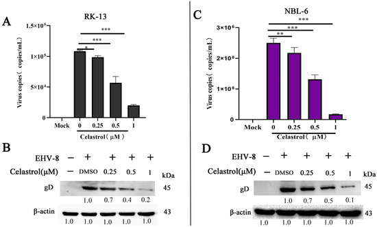 Celastrol exerts anti-EHV-8 activity in a dose-dependent manner. The RK-13 (A,B) and NBL-6 (C,D) cells were seeded into 12-well cell plates, then pre-treated with celastrol at different doses (0.25, 0.5, and 1 μM) for 2 h, and then incubated with EHV-8 SDLC66 at 0.1 MOI. These cell culture supernatants and cells were collected at 24 hpi to detect progeny virus generation and gD protein expression by qPCR and Western blot. The β-actin serves as a loading control. These data are presented as the mean ± SD of three independent experiments. * p < 0.05, ** p < 0.01, *** p < 0.001. The DMSO treated group served as 0 μM celastrol.