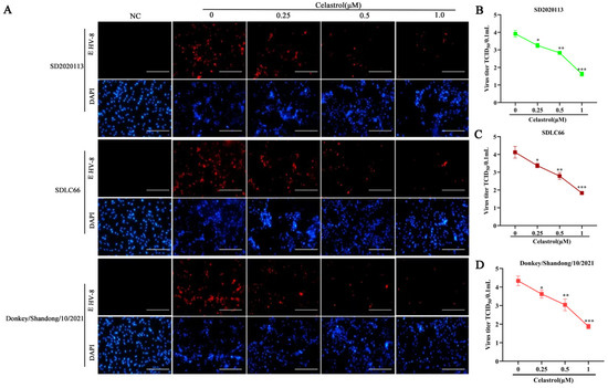 Rabbit kidney cells (RK-13) and E. Derm cells (NBL-6) were cultured in Modified Eagle’s medium (MEM, Gibco, Fort Worth, TX, USA) supplemented with 10% fetal bovine serum (FBS, LONSERA, Ciudad de la Costa, Uruguay) and 1% penicillin–streptomycin (Beyotime, Nanjing, China) at 37 °C and 5% CO2. The EHV-8 SDLC66 strain (GenBank: MW816102.1), SD2020113 (GenBank: MW822570.1), and donkey/Shandong/10/2021 (GenBank: OL856098.1) were propagated in RK-13 cells. Celastrol was purchased from Sparkiade Biotechnology Co. Ltd. (Jinan, China) and dissolved in dimethyl sulfoxide (DMSO) (Solarbio, Beijing, China), and the final concentration is 1 mM.