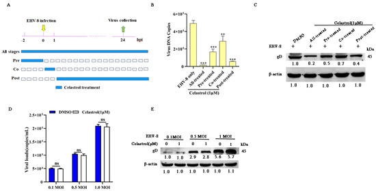 Celastrol reduces EHV-8 infection at multiple stages. Time-of-addition schematic (A). The NBL-6 cells were infected with 0.1 MOI EHV-8 SDLC66 and treated with celastrol at different time points, including All-stage treatment, Pre-treatment, Co-treatment, and Post-treatment. The NBL-6 cells were treated with celastrol (1 μM) as All-stage treatment, Pre-treatment, Co-treatment, and Post-treatment, whereafter, infected with EHV-8 SDLC66 at 0.1 MOI. These cell supernatants were collected to detect progeny virus generation by qPCR (B). Meanwhile, these cells were harvested to detect gD expression using Western blot (C). The NBL-6 cells were incubated with a mixture of EHV-8 SDLC66 (0.1, 0.5, and 1 MOI) and celastrol (1 µM) or DMSO, and the cellular supernatants and cells were collected 24 hpi to analyze the progeny viral copies (D) and gD expression (E) using qPCR and Western blot. β-actin acts as loading control. The data represent mean ± SD from three independent experiments. ** p < 0.01; *** p < 0.001; ns: no significant.
