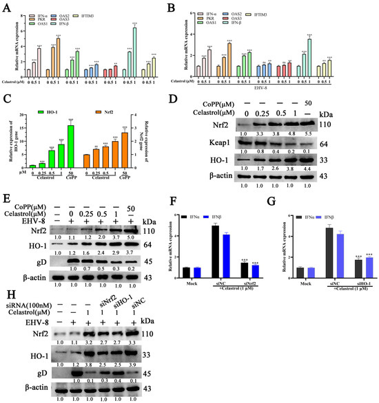 Previous studies have demonstrated that the Nrf2/HO-1 signaling pathway regulates IFN-α-related antiviral responses [22,25,26,27]. To determine whether celastrol induces IFN-α-related antiviral gene expression through Nrf2/HO-1 activation, we quantified the protein levels of Nrf2, HO-1, and viral gD in celastrol-treated NBL-6 cells at varying concentrations. The results revealed significant upregulation of both Nrf2 and HO-1 (Figure 5C,D), accompanied by decreased viral gD protein expression (Figure 5E). To validate the role of Nrf2/HO-1 in celastrol-mediated antiviral responses, we transfected NBL-6 cells with Nrf2- or HO-1-specific siRNAs prior to celastrol treatment. Knockdown of either Nrf2 or HO-1 significantly attenuated IFN-α/β expression compared to the siRNA negative control (siNC) group (Figure 5F,G). Western blot analysis confirmed that Nrf2 or HO-1 silencing resulted in reduced Nrf2 and HO-1 protein levels and increased viral gD protein expression (Figure 5H). These results demonstrate that celastrol induces an antiviral IFN response against EHV-8 infection through activation of the Nrf2/HO-1 signaling pathway.