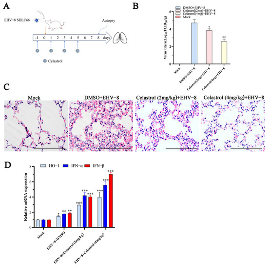 Celastrol decreases EHV-8 replication in mice. Twelve BALB/c mice were divided into four groups randomly: Mock group (only 2.5%DMSO treated); DMSO + EHV-8 infected group; Celastrol (2 mg/kg) + EHV-8 infected group; and Celastrol (4 mg/kg) + EHV-8 infected group. (A) The pattern diagram of the animal experiments. (B) The lung tissues of different groups were collected at 8 dpi to detect EHV-8 replication by TCID50. * p < 0.05; ** p < 0.01 compared with the DMSO + EHV-8 infected group. (C) Representative images of hematoxylin and eosin (H&E) staining in the lungs derived from different groups mice. Scale bar, 100 µm. (D) Total RNA was extracted from the lung tissues of different group mice at 8 dpi, and the mRNA expression levels of HO-1 and IFN-α/β were detected using qPCR. GAPDH serves as control. These data are presented as the mean ± SD of three independent experiments. * p < 0.05, ** p < 0.01, *** p < 0.001.