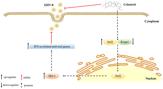 The Scheme diagram of the celastrol against EHV-8 infection mechanism. Celastrol inhibits EHV-8 infection at multiple stages in susceptible cells Via Nrf2/HO-1 signal axis activation, causing host cellular type I IFN response generation, and resulting in the inhibition of EHV-8 replication.