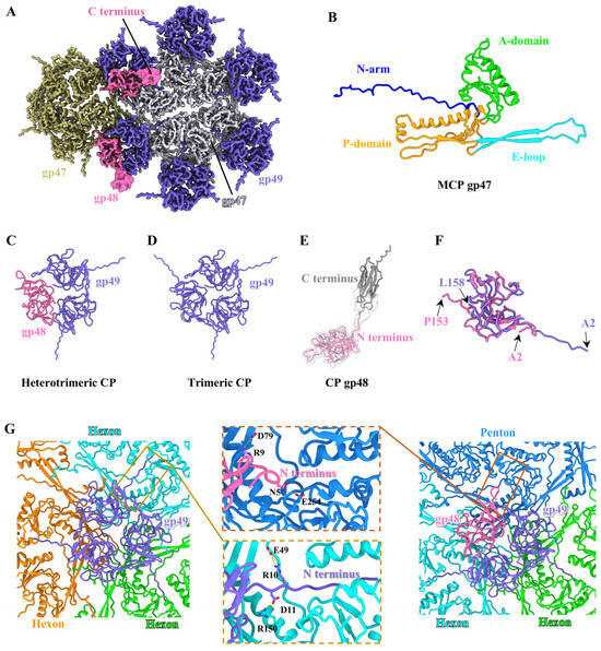 Based on the density map of the T1 head, we built the atomic model of MCP gp47 from residues 27 to 319 (out of 319 residues) (Figure 2A and Figure S3B), which displays a structural similarity to the MCP gp5 in HK97 [] (Figure S4A), MCP gp7 in VP1 [] and MCP gp2 in GP4 []. According to the nomenclature of the MCP gp5 in HK97, each gp47 is composed of a long N-terminal arm (residues 27–61), a periphery P-domain (residues 62–70, 108–166 and 275–306), an extended E-loop (residue 71–107), and an axis A-domain (residues 167–274 and 307–319) (Figure 2B). An asymmetric unit of the icosahedral head comprises seven gp47 monomers, including one hexon and one-fifth of a penton (Figure S4B). The structural superimposition of the seven gp47 monomers in an asymmetric unit reveals significant conformational change in the E-loops and N-arms (Figure S4C). The conformational discrepancy of all gp47 monomers permits the formation of 11 pentons and 60 hexons, which are ultimately assembled into an icosahedral capsid with T = 7 (Figure S4D). It is noteworthy that the two types of CP are situated around the icosahedral threefold and quasi-threefold axes of the T1 head (Figure 2A), including homologous trimeric CP gp49 and heterotrimeric CP (each comprising one gp48 monomer and two gp49 monomers) (Figure 2C,D). We built the atomic models for gp49 from residues 2 to 158 of the total 158 residues and for the N-terminus of gp48 from residues 2 to 153 (out of the 255 residues) (Figure S3B). However, the C-terminus of gp48, exhibited a weak protrusion density, which could not be resolved to a high resolution (Figure 2A), and its atomic model (residues 154–255) was generated in conjunction with AlphaFold3 (Figure 2E). Both gp49 and the N-terminus of gp48 adopt a typical β-tulip fold structure (Figure 2C,D), which is analogous to that observed in the CP gp56 of TW1 [], and CP gpD of lambda [] and triplex proteins of herpesvirus []. The structural comparison of the two types of CPs reveals that gp49 in the heterotrimeric CPs adopts a topology identical to that in the homologous trimeric CPs (Figure S4E). However, gp49 exhibits a slight conformational difference from the N-terminus of gp48 (Figure 2F).