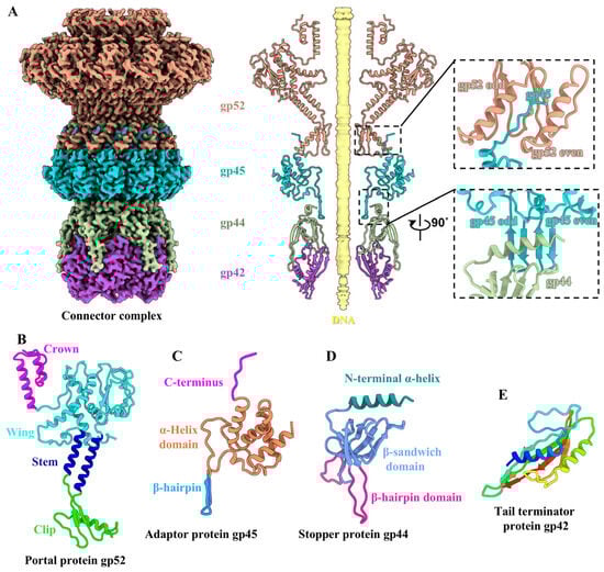 Structures of the connector complex. (A) Side view (left) of the density maps and slab view (right) of the ribbon models of the connector complex. The insets show the zoomed-in views of the interactions among the portal–adaptor and the adaptor–stopper. The color coding is identical to that used in Figure 1A. (B–D) Ribbon models of the portal protein gp52 (B), the adaptor protein gp45 (C), and the stopper protein gp44 (D), colored according to their domains. (E) Ribbon model of the tail terminator protein gp42 shown in rainbow colors.