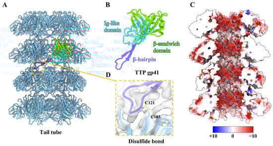 Structure of the tail tube. (A) Side view of four layers of hexameric tail tube (cornflower blue). Only one monomer of tail tube protein gp41 is colored according to its domains. (B) Ribbon model of TTP gp41, colored according to its domains. (C) Cut-open view of the electrostatic potential of the inner surfaces of tail tube. The electrostatic potential scale is shown in the color bar. (D) Zoomed-in view of the inter-ring interactions by the disulfide bond.