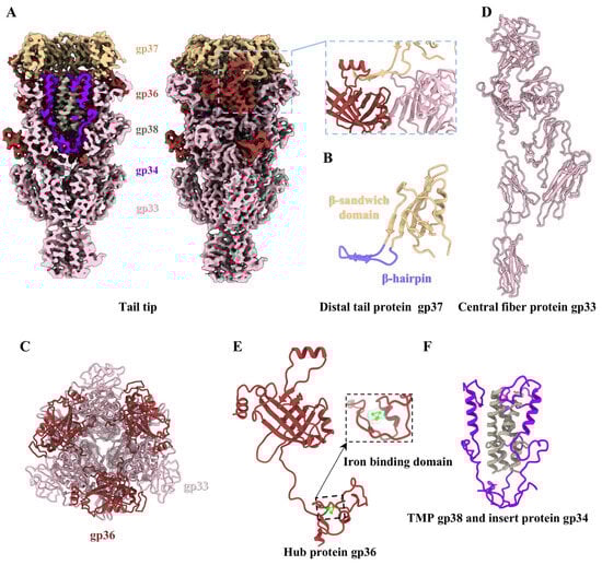 Siphophages possess a long, flexible, and non-contractile tail that plays a crucial role in host recognition, cell envelope penetration, and DNA injection [,]. Connected to the head through a connector complex, the tail of a siphophage consists of three main components: a tail tube, a tape measure protein (TMP), and a distal tip [,]. During infection, the tail tip penetrates the cell envelope. Triggering TMP release transmits a signal along the tail tube to the head, enabling DNA release into the host cytoplasm [,,]. All siphophages resolved at near-atomic resolution exhibit common morphological features, including the head, the connector complex, and the tail tube [,,,]. Nevertheless, their tail tips exhibit remarkable structural diversity, with examples including the tips of siphophages lambda [], R4C [], 80α [], TP901-1 [], and JBD30 []. Siphophages with a cone-shaped distal tip are widely distributed in nature. A representative example is siphophage lambda [,], which has a tip that mainly contains the distal tail protein, hub protein, central fiber protein, and insertion protein, flanked with lateral fibers. Nevertheless, structural characterization of lambda-like siphophages remains limited. To date, only four siphophage structures have been resolved at high resolution, namely lambda [], T5 [], DT57C [], and Chi []. During the infection process, the central fiber proteins of lambda [] and T5 [,] are capable of bending and bringing the tail closer to the cell membrane, thereby facilitating further infection. In contrast, the tail tip of DT57C does not exhibit this bending behavior []. Despite these siphophages sharing characteristic cone-shaped distal tips, their specific structural details require further elucidation.