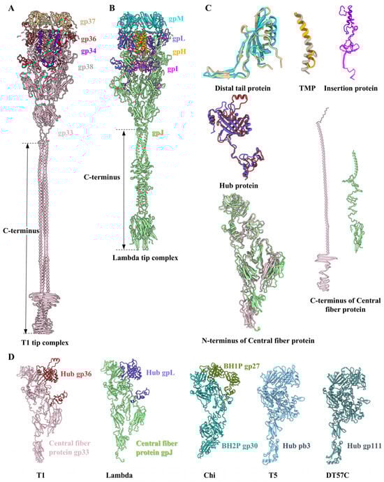 Structural comparison of tail tip proteins in different siphophages. (A,B) Cut-open views of ribbon models of the tail tips in T1 (A) and lambda ((B), PDB ID: 8k35 and 8xck). (C) Structural comparisons of ribbon models of all tail tip proteins between T1 and lambda, revealing the obvious topological similarity. The color coding is identical to that used in (A,B). (D) Structural comparisons of ribbon models of the tip (the central fiber protein and/or hub protein) among lambda-like siphophages, including T1, lambda (PDB ID: 8k35 and 8xck), Chi (PDB ID: 8VJH), T5 (PDB ID: 7zhj), and DT57C (PDB ID: 8hqz).