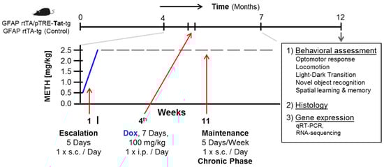 Schematic of overall experimental protocol. Mouse cohort consisted of two genotypes, GFAP-rtTA+/pTRE-Tat+ (40 mice) and GFAP-rtTA+/pTRE-Tat− (43 mice) with 35 females and 48 males, 83 mice total. The 12-week METH regimen entailed the following steps: Week 1, starting at 0.5 mg/kg s.c., 1 × day, step-wise increase by 0.5 mg/kg with each injection over 5 days (Mon–Fri), followed by 11 weeks 1 × 2.5 mg/kg/day (Mon–Fri = 20+ days per month). Controls received vehicle (saline). All animals were treated with Doxycyclin (Dox).