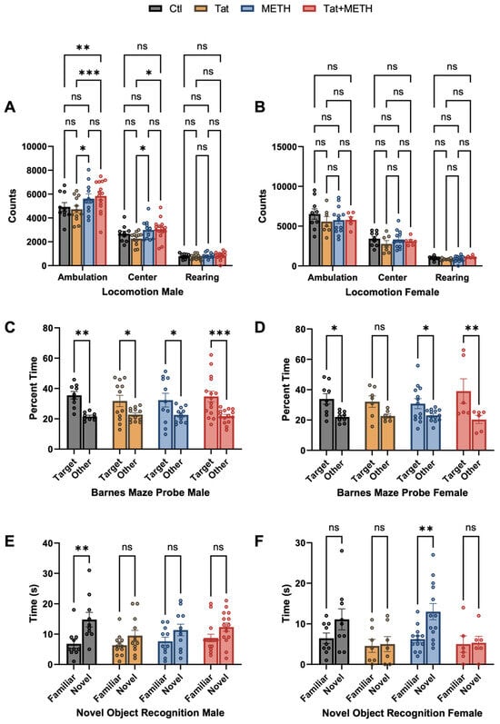 In the BM task, no clear, significant sexual dimorphism was detected, but Tat + METH animals performed better compared to Tat- or METH-only groups. In the NOR test, however, females were more affected by Tat in two groups, Tat and Tat + METH. It is important to note that in the female control, the difference in time spent with the familiar and novel object did not reach the significant cut-off p ≤ 0.05 level (p = 0.0708). This may be associated with normal aging as diminishing performance in the NOR test has been shown to start as early as 10 months of age [40]. On the other hand, female animals receiving METH performed better in the NOR task compared to all other groups. This observation indicates that the areas of the brain that are responsible for performance in BM and NOR, respectively, may be differently affected by the presence of Tat and exposure to METH. BM is a behavioral task assessing spatial learning and memory, which mainly relies on hippocampal activity [41,42]. On the other hand, performance on the NOR test utilizes parts of the hippocampus (CA1/CA3), as well as other brain regions such as insular cortex, perirhinal cortex, and medial prefrontal cortex [43,44,45,46]. The effect that Tat and METH each independently and Tat + METH combined had on these specific locations in the brain may be distinct, thus leading to distinct outcomes of specific behavioral tests of memory performance.