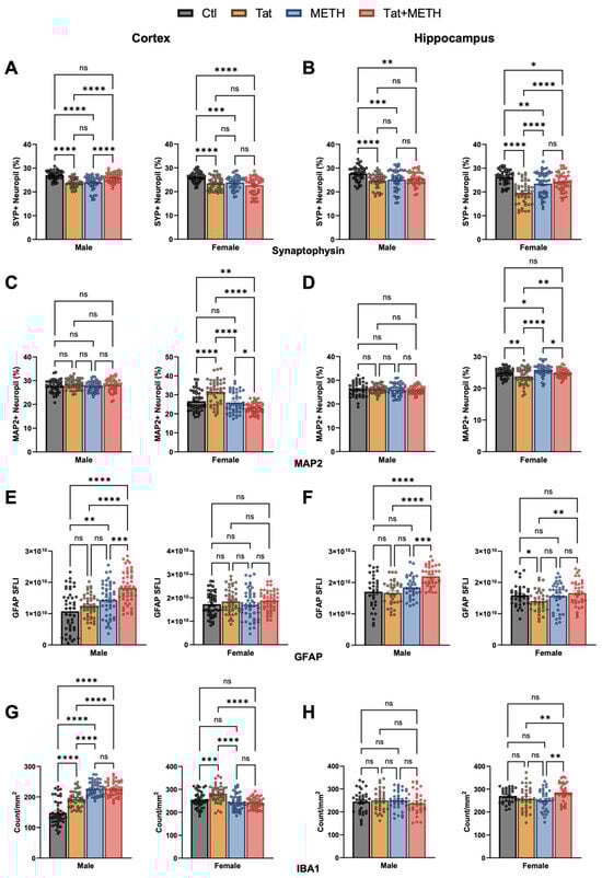 Analysis of MAP2+ neuropil did not indicate any injury of neurites in male cortex or hippocampus (Figure 4C,D). Female animals, however, unexpectedly showed an increased MAP2+ neuropil in the cortex of Tat animals compared to Ctl, METH, and Tat + METH. That finding could reflect a disturbance of MAP2 homeostasis rather than the loss seen in hippocampus (Figure 4D). Females of the METH group had a MAP2+ neuropil equivalent to Ctl, whereas Tat + METH animals showed a decrease of MAP2+ neuropil to lower than the other three groups (Figure 4C). Analysis of MAP2+ neuropil in cortex and hippocampus indicated that neurites in the female brain were much more affected than in the male counterpart (Figure 4C,D). Altogether, exposure to Tat and METH, each alone and in combination, resulted in significant loss of presynaptic terminals, with the exception of male cortex, while Tat caused disparate disturbances of MAP2+ neurites only in females. Thus, a part of the overall neuronal injury occurred in a sex-dependent fashion. Moreover, the combination of Tat + METH seemed to avoid the loss of presynaptic terminals in LIII of male cortex.
